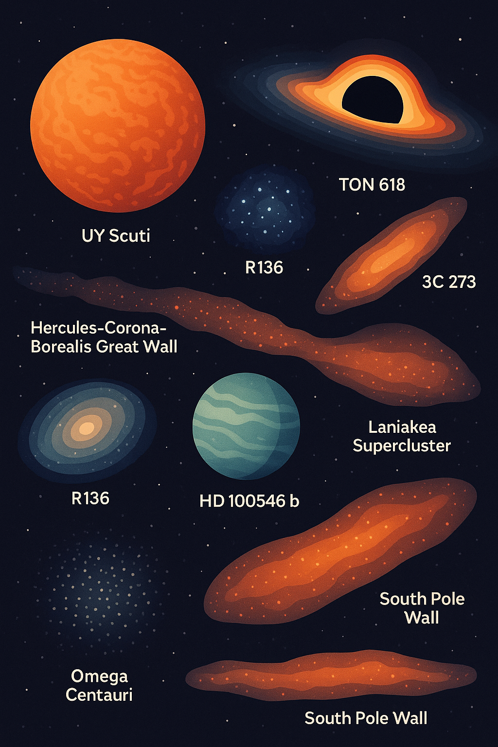우주에서 가장 큰 것들 TOP 10 | 가장 큰 별, 은하, 블랙홀까지메타디스크립션: 우주에서 가장 큰 것들 TOP 10을 소개합니다. 가장 큰 별, 은하, 블랙홀 등 인간의 상상을 초월하는 천체들의 규모와 특징을 순위로 알아보세요.우주에서 가장 큰 것들 TOP 10우주에서 가장 큰 것들은 인간의 상상력을 뛰어넘습니다. 가장 큰 별, 가장 큰 은하, 그리고 가장 큰 블랙홀까지, 이 거대한 존재들은 우리가 사는 지구를 극히 작은 점으로 보이게 합니다. 오늘은 흥미로운 순위 형식으로 우주의 압도적인 크기를 자랑하는 천체들을 정리했습니다.1. 가장 큰 별 – UY 스쿠티UY 스쿠티는 현재까지 관측된 가장 큰 별로, 태양보다 반지름이 약 1700배 이상 큽니다. 만약 태양을 축구공 크기로 표현한다면, UY 스쿠..