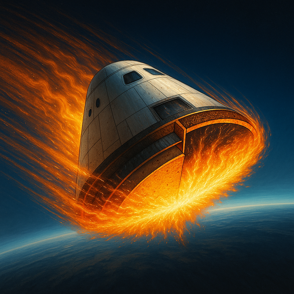대기권 재진입 시 우주선은 초음속(711km/s) 속도로 지구 대기와 충돌합니다.3,000°C까지 치솟아 구조체를 녹일 위험이 있습니다.