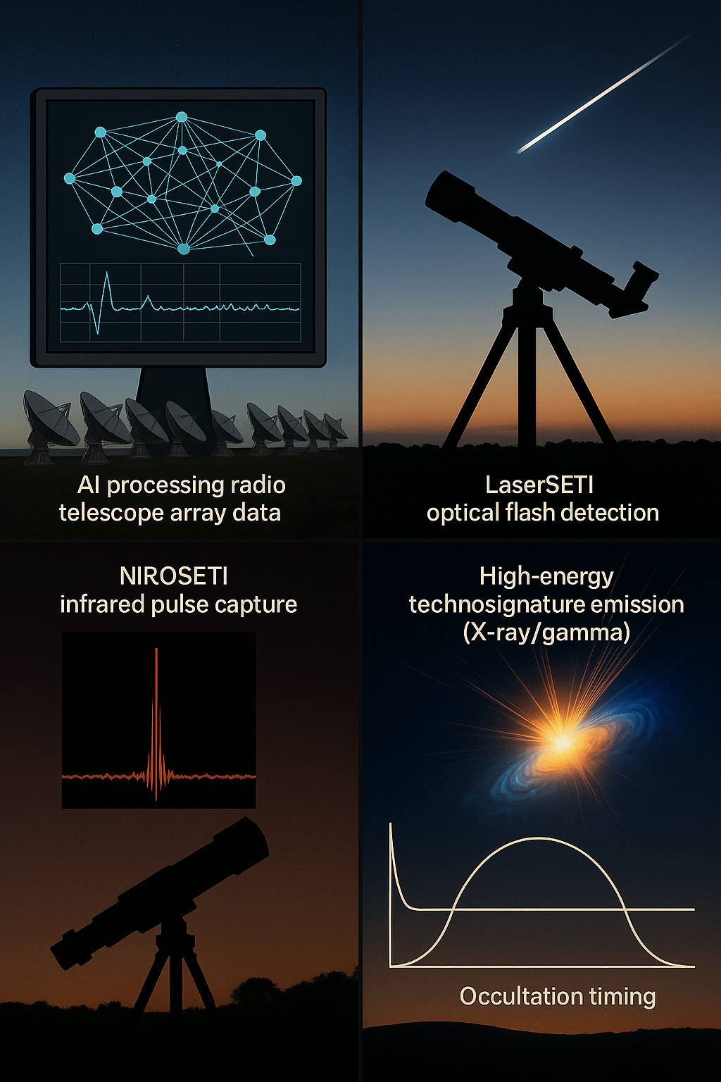 또한, 최근에는 Bayesian 시계열 및 fuzzy logic 기반 MCDM 전략을 활용하여 탐색 우선순위를 정하는 방법론도 제안되었는데, 이를 통해 다양한 기술사인(technosignature) 간 비교 평가가 가능해졌습니다. - LaserSETI & NIROSETI 광학 및 근적외선 탐지