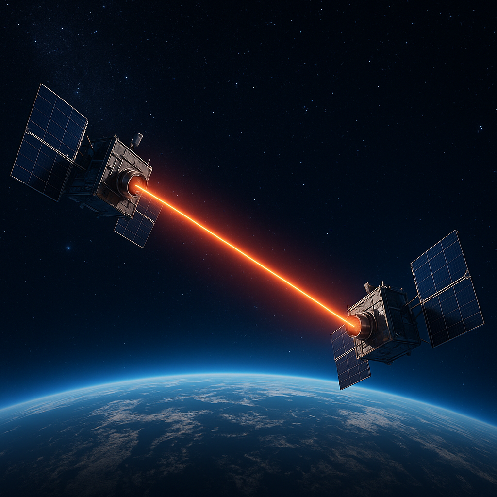 위성 간 레이저 통신은 두 위성 간에 고출력 레이저를 사용해 빛 신호로 데이터를 주고받는 기술을 의미합니다.