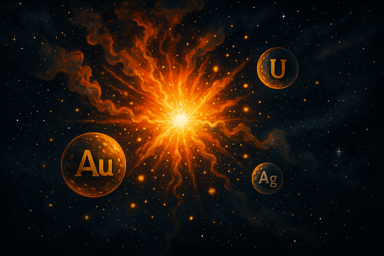 초신성 폭발이 일어나면, 엄청난 양의 중성자가 짧은 시간에 대량으로 방출됩니다. 이때, 철 등의 무거운 원소의 핵이 이 중성자를 순식간에 포획하면서 더 무거운 원소로 변하게 됩니다. 이 과정이 바로 r-과정입니다. r-과정에서는 수백 밀리초 만에 금(Au), 우라늄(U), 은(Ag) 등 다양한 철보다 무거운 원소가 빠르게 합성됩니다. 이 원소들은 이후 초신성 폭발의 잔해와 함께 우주 공간에 뿌려지게 됩니다.